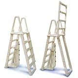 Evolution A-Frame Ladder (Model #7100B) Economical yet full-featured A-Frame Ladder Adjustable to fit 48" to 54" high pools Each side adjusts independently Snap-lock treads for quicker, easier assembly Five treads on each side Swing-up outer treads for safety Outer treads can be padlocked (padlock included) Treads measure 3-3/4" x 16" wide Strong sturdy design Large top platform measures 12" x 20" Minimal hardware No sand or bricks required; fills with water Five year pro-rated warranty Weight guideline: 300 lbs. Padlock included Ladder accommodates up to 11" wide pool tops at 52" height Read more
